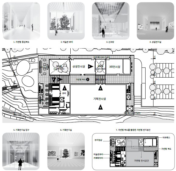 복도는 단순한 순환 통로가 아닌, 7.5m 폭의 광장형 회랑으로서 기능하며, 전시 외에도 강연, 경매, 퍼포먼스 등 공공 행위가 펼쳐지는 열려 있는 축이 된다. 이 복도는 동서 방향으로 미술관 전체를 관통하고, 남북으로 펼쳐진 기획·상설·XR 전시실을 통합하는 주체로 작용한다.